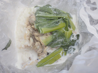 小松菜と生姜を入れてカルローズ(お米)を入れて牛乳を入れる、